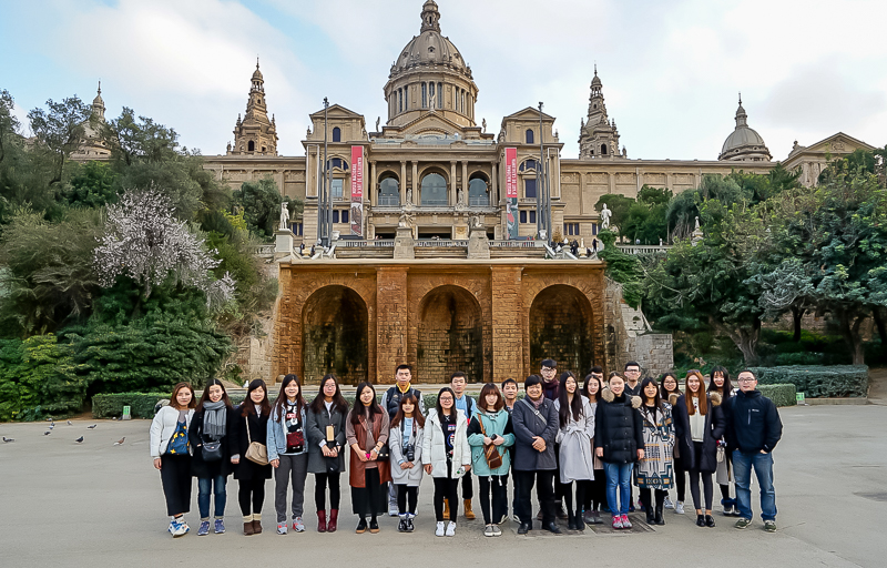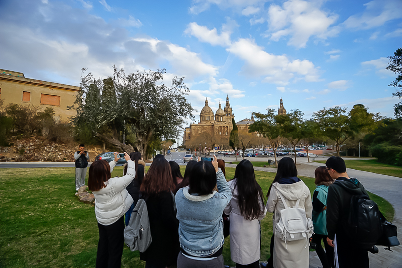 下午2点40分,访学团抵达巴塞罗那。到达酒店卸下行李后,访学团开始了在巴塞罗那的行程。下午16点,访学团在马林老师的带领下经西班牙广场到达西班牙王宫旧址。西班牙王室在早年间已搬迁至马德里,而位于巴塞罗那的旧居则变成了国家自然历史艺术博物馆(又称加泰罗尼亚博物馆),向公众开放。