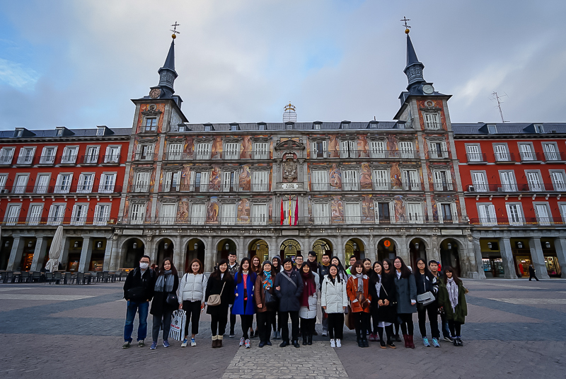 下午5点45分,访学团沿小巷行走,步行到达马约尔广场。这个有着独特风格的四方形广场是由多幢四层高的建筑所联围而成,初建至今已有四百多年。广场在建成之后的漫长岁月里曾经历了三次火灾,又重新修建,直至1953年完成后才形成如今的样子。马林老师表示:“在广场中央是菲里普三世的青铜骑马雕像,但整个广场的亮点却是某幢建筑之上所绘制的彩绘,彩绘十分精细,颇具西班牙风格。”访学团成员均对此表示赞同,并提议在建筑彩绘前合影纪念。