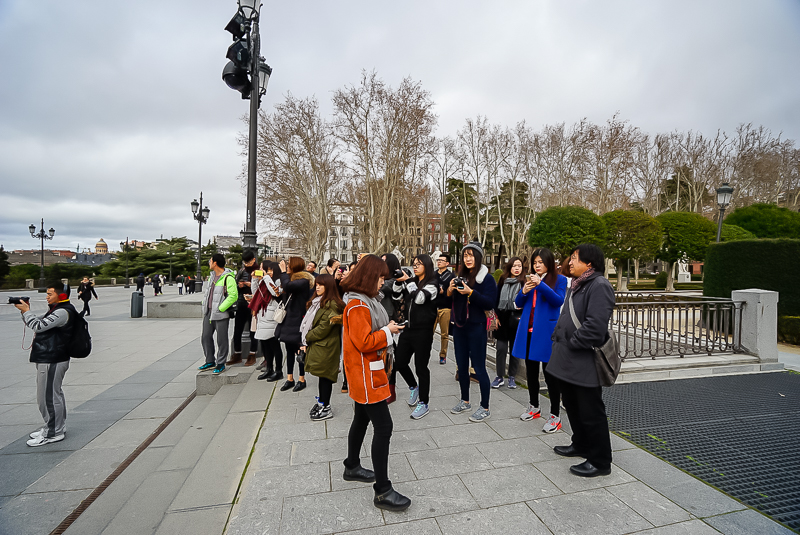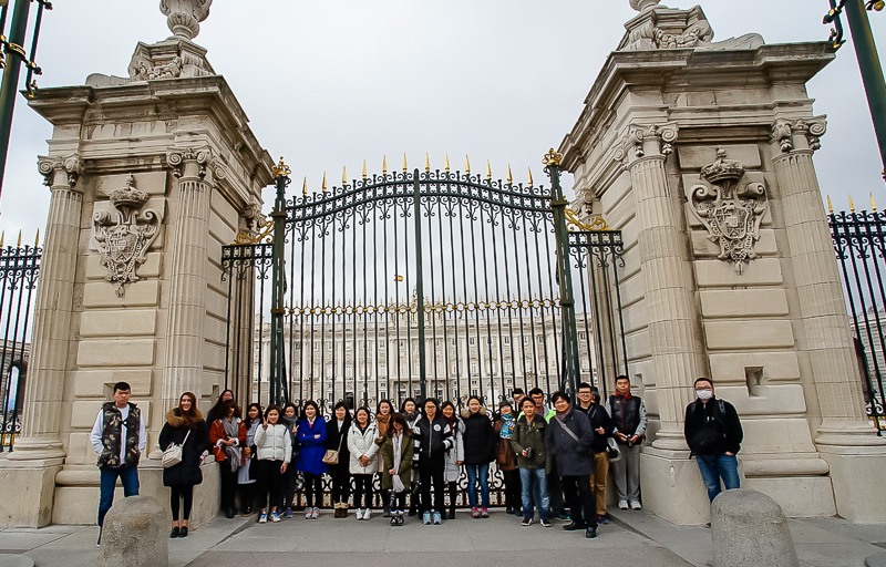 下午2点30分,访学团抵达马德里皇宫(Palacio Real deMadrid)。马德里皇宫是仅次于凡尔赛宫与维也纳美泉宫的欧洲第三大皇宫。而如今的马德里皇宫,则是在1734年的圣诞节被烧毁的巴奔堡皇家宫殿基础上,在1736年,由菲里普五世和王妃依沙贝尔·德法尔内西奥计划重新修建而成的。其外部的阿尔梅利亚广场和巴尔克尼是法国风格,而建筑内部则是当时流行的意大利风格。但由于时间原因,访学团无法进入内部参观,马林老师便邀访学团全体成员在皇宫外部合影留念,并示意访学团可于合影结束后在皇宫外部的广场上自行观赏。
